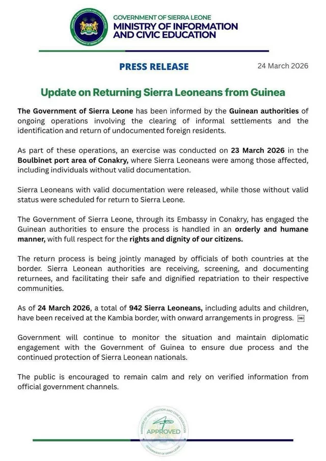 Le gouvernement de Sierra Leone a confirmé, dans un communiqué publié le 24 mars 2026, le retour de 942 de ses ressortissants en provenance de la Guinée, dans un contexte d’opérations menées par les autorités guinéennes contre l’immigration irrégulière.