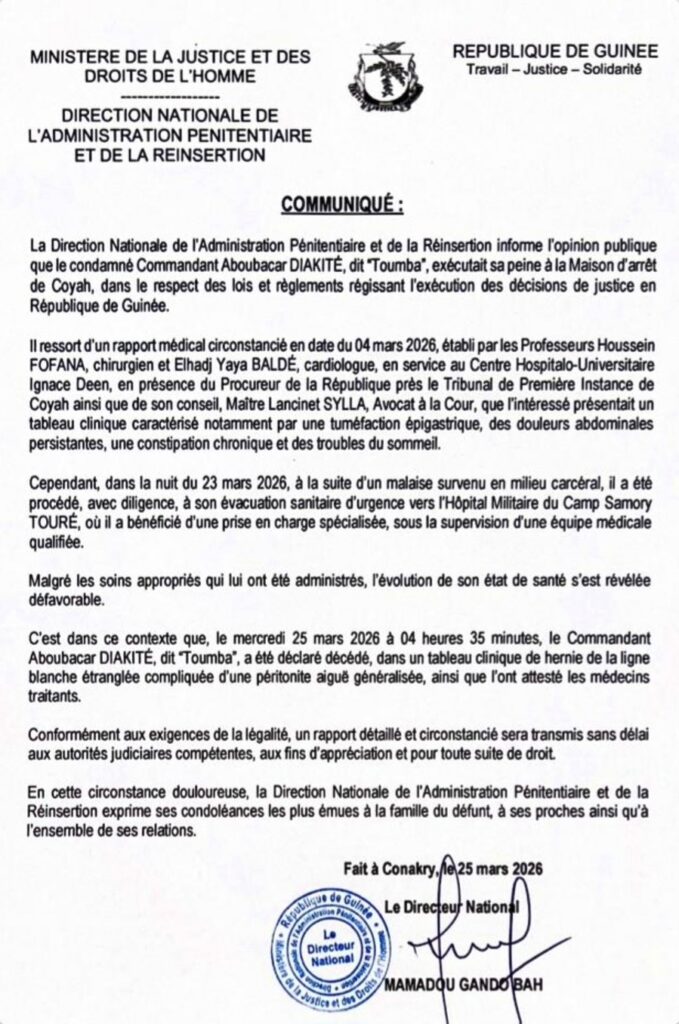 Selon un communiqué officiel consulté par notre rédaction, le détenu, incarcéré à la Maison d’arrêt de Coyah, est décédé à 04h35 à l’Hôpital militaire du Camp Samory Touré, où il avait été transféré en urgence pour une prise en charge spécialisée.